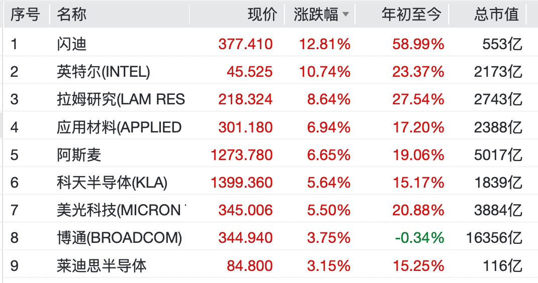 芯片股方面,英特尔涨超10%,闪迪涨近13%,拉姆研究、应用材料、阿斯麦涨超6%,美光科技涨逾5%,股价创收盘新高。