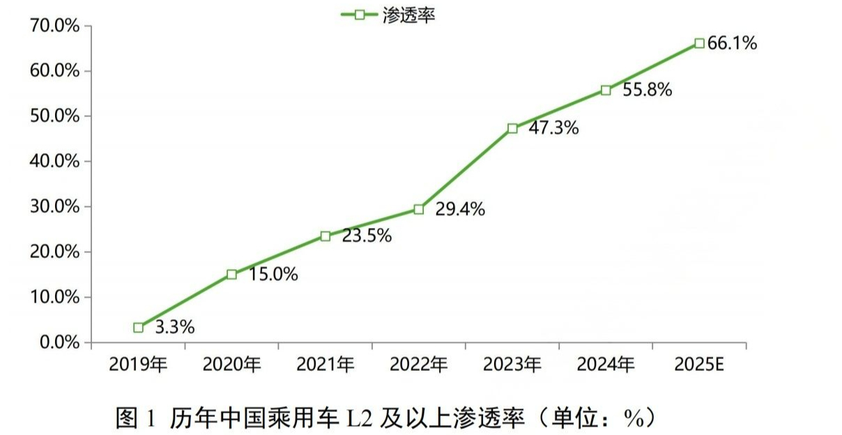 《报告》显示,2025年前三季度,我国具备组合驾驶辅助功能(L2级)的乘用车新车销量同比增长21.2%,渗透率达64%,预计2025年年底将升至66.1%,三分之二左右的新车型将搭载L2级辅助驾驶功能。