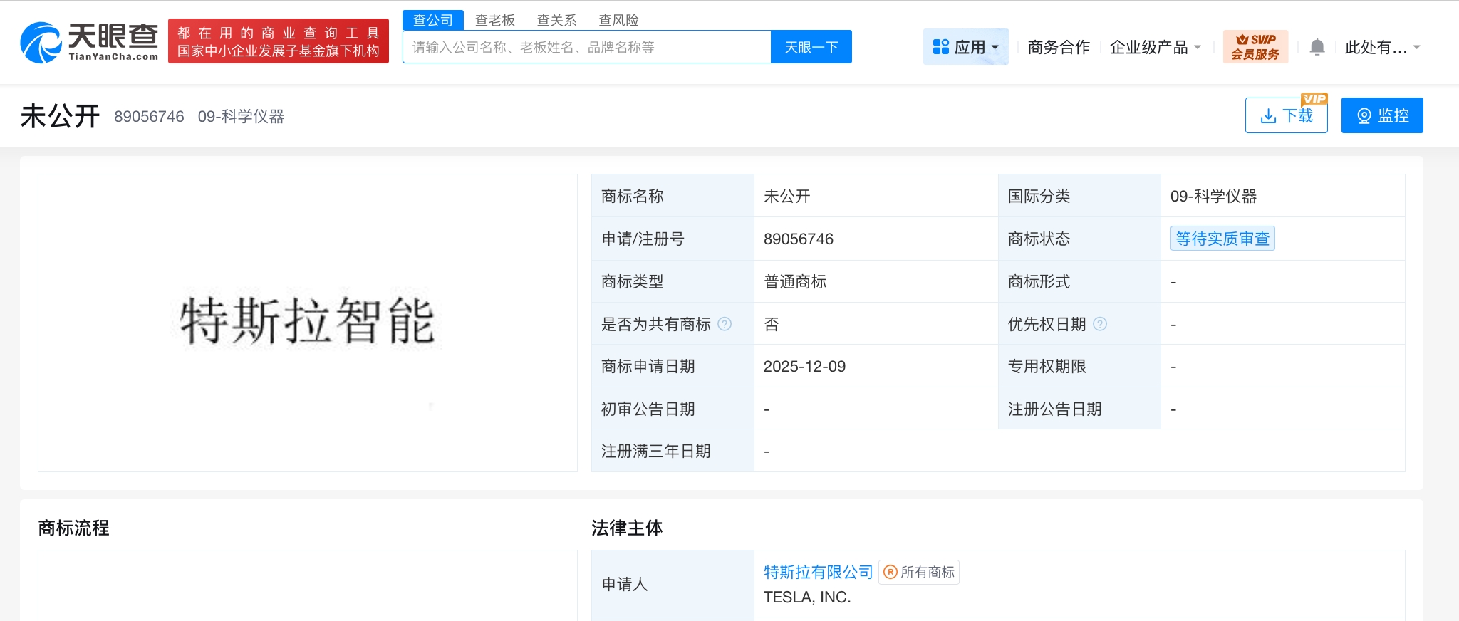天眼查知识产权信息显示,近日,特斯拉有限公司申请注册两枚“特斯拉智能”商标,国际分类为科学仪器、网站服务,当前商标状态均为等待实质审查。