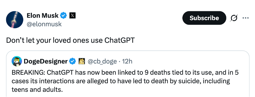 OpenAI CEO山姆·奥特曼(Sam Altman)随即在X上回应。他不仅为OpenAI的产品和安全措施辩护,还将矛头直接转向了特斯拉的自动驾驶技术,发文称, “我只坐过一次装有该系统的车,但我第一感觉是特斯拉推出这个东西远谈不上安全。”