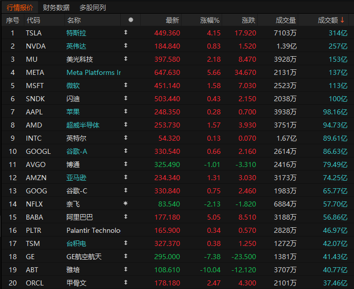 第3名美光收高2.18%,股价再创历史新高,成交153亿美元。法国巴黎银行将美光科技目标价从270美元上调至500美元。