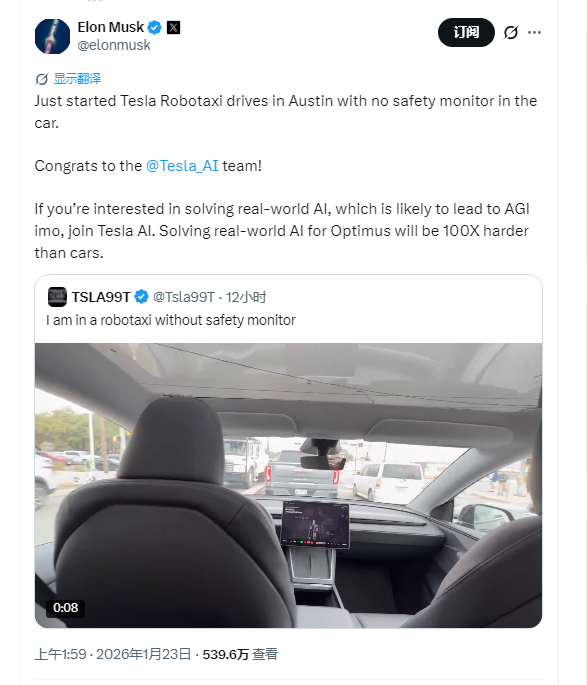 上证报中国证券网讯当地时间1月22日,特斯拉CEO埃隆·马斯克在社交媒体宣布,在美国得克萨斯州奥斯汀启动了特斯拉Robotaxi服务,车内没有安全监督员。