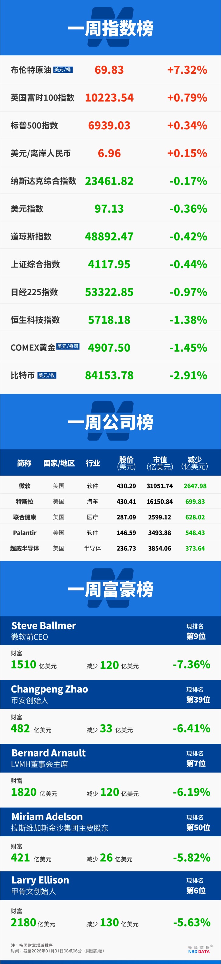 1月30日凌晨,加密货币市场也集体大跌,比特币价格一度跌至81000美元,24小时内最大跌幅超7%。截至1月31日08:06,比特币报84153美元,本周跌2.91%。
