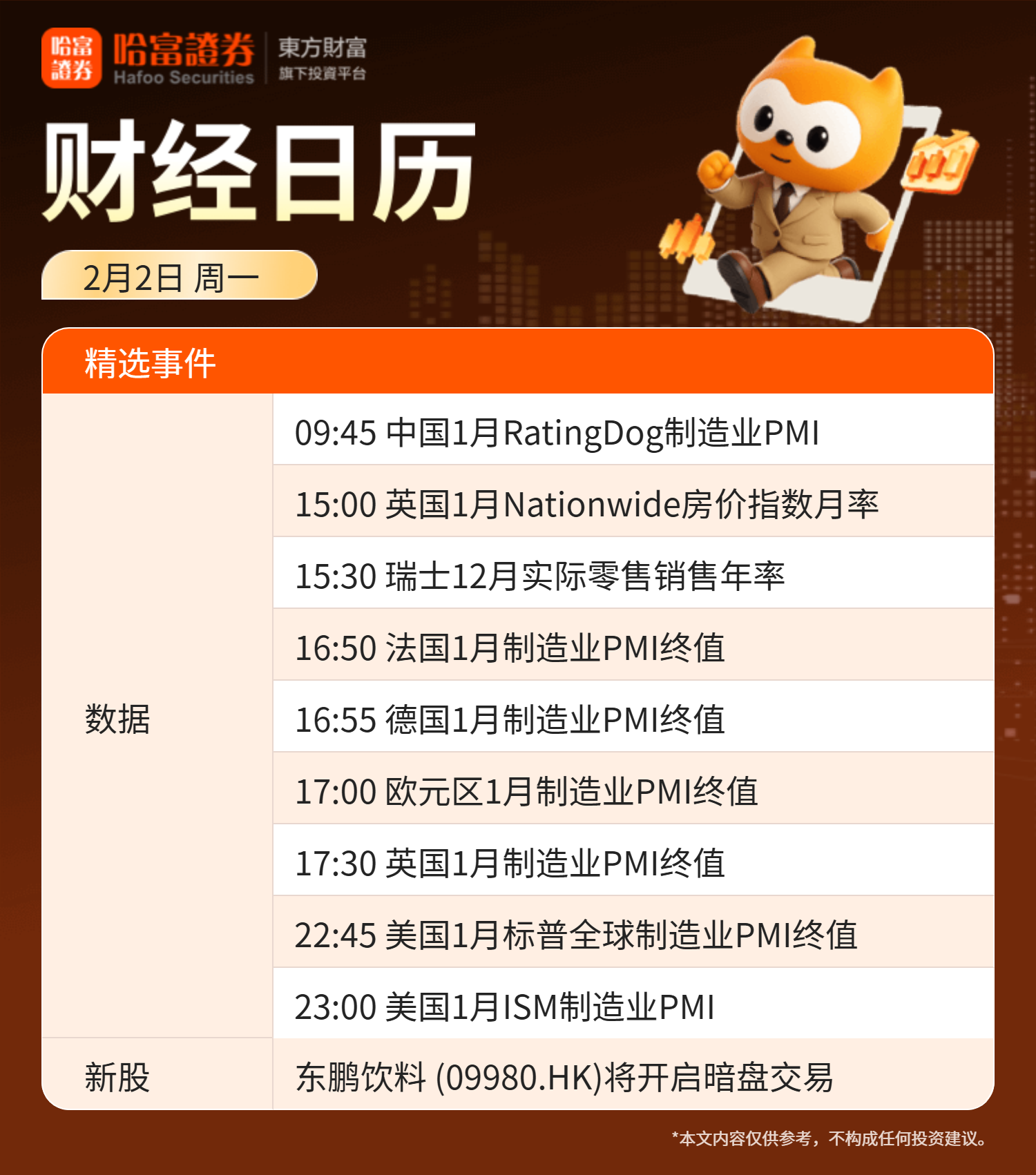 商品:COMEX黄金期货下跌8.88%,报4846.20美元/盎司,1月份累计涨11.93%,29日曾达到5586.29美元。COMEX白银期货暴跌27.18%,报83.3美元/盎司,脱离29日所创历史最高位121.785美元,1月份累计涨18.90%。WTI 3月原油期货收报65.21美元/桶。布伦特3月原油期货收报70.69美元/桶。