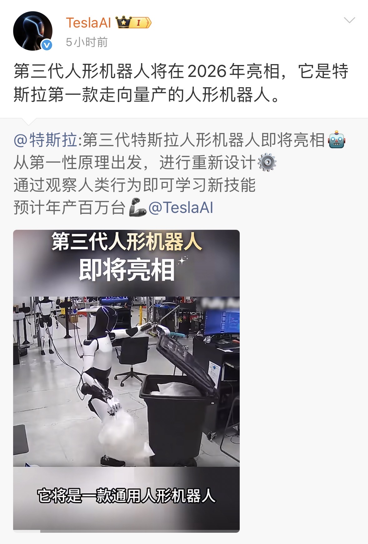 2月2日,特斯拉官方微博发布内容并配发视频称,第三代特斯拉人形机器人即将亮相,这是特斯拉第一款走向量产的人形机器人。