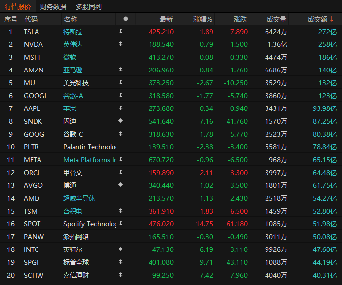 第16名Spotify收高14.75%,成交51.98亿美元,此前该公司公布的2025年第三季度业绩超出华尔街预期。