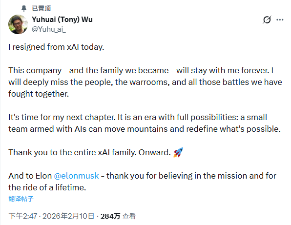 2月10日,xAI联合创始人吴宇怀发文称,他当天从xAI辞职了。吴宇怀说,他将永远铭记这家公司,以及他们共同缔造的大家庭,他将开启人生新篇章。吴宇怀说,这是一个充满无限可能的时代:一支装备人工智能的小团队足以移山填海,重新定义可能性的边界。他同时也感谢马斯克对“使命的信任”。