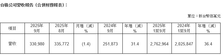 台积电:9月合并营收3309.8亿元新台币 同比增加31.4%