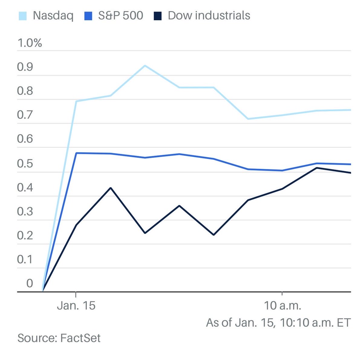 受益于人工智能热潮的关键供应商台积电公布强劲财报,以及华尔街大型银行的亮眼业绩,芯片股和大盘指数周四早盘上涨。