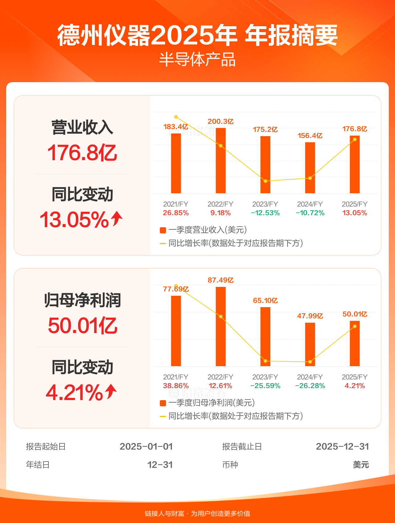 德州仪器1月27日发布年报业绩,截至2025年12月31日的12个月内,该公司营业收入176.82亿美元,同比增长13.05%;公司权益持有人应占溢利(归母净利润)50.01亿美元,同比增长4.21%。