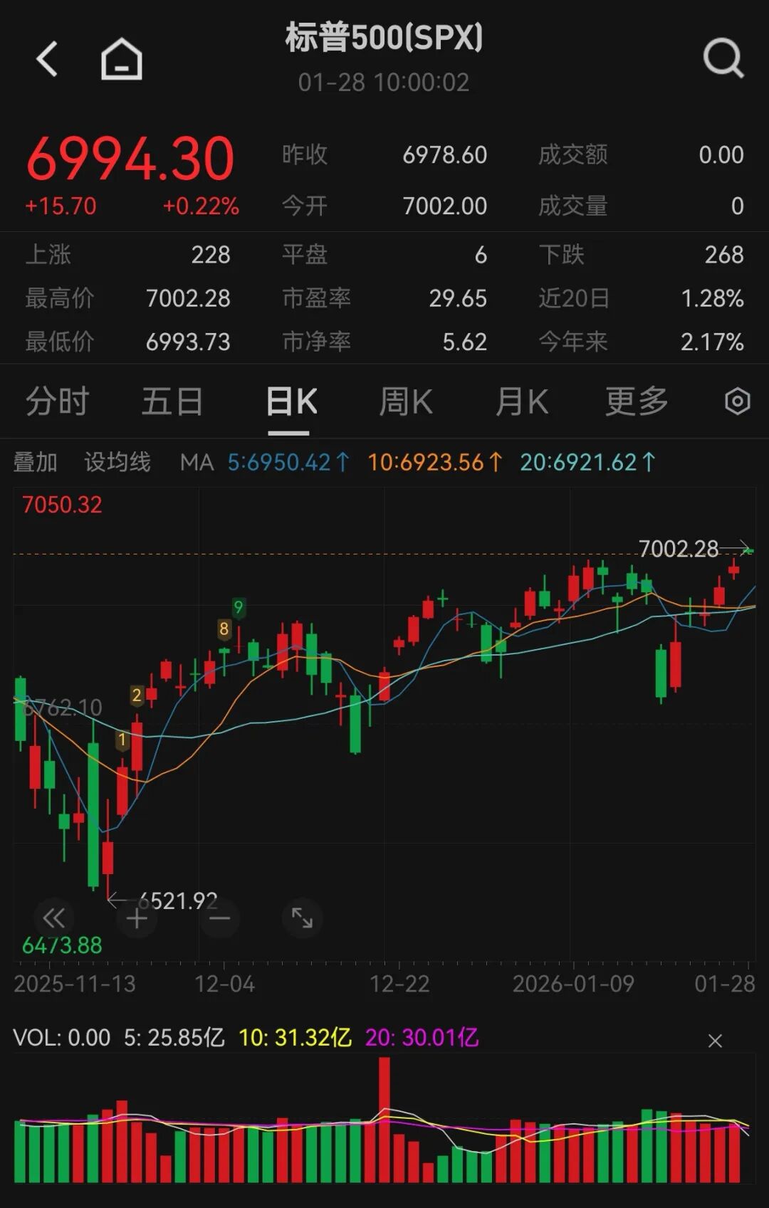 1月28日晚间,美股三大指数集体高开。标普500指数盘中突破7000点大关。