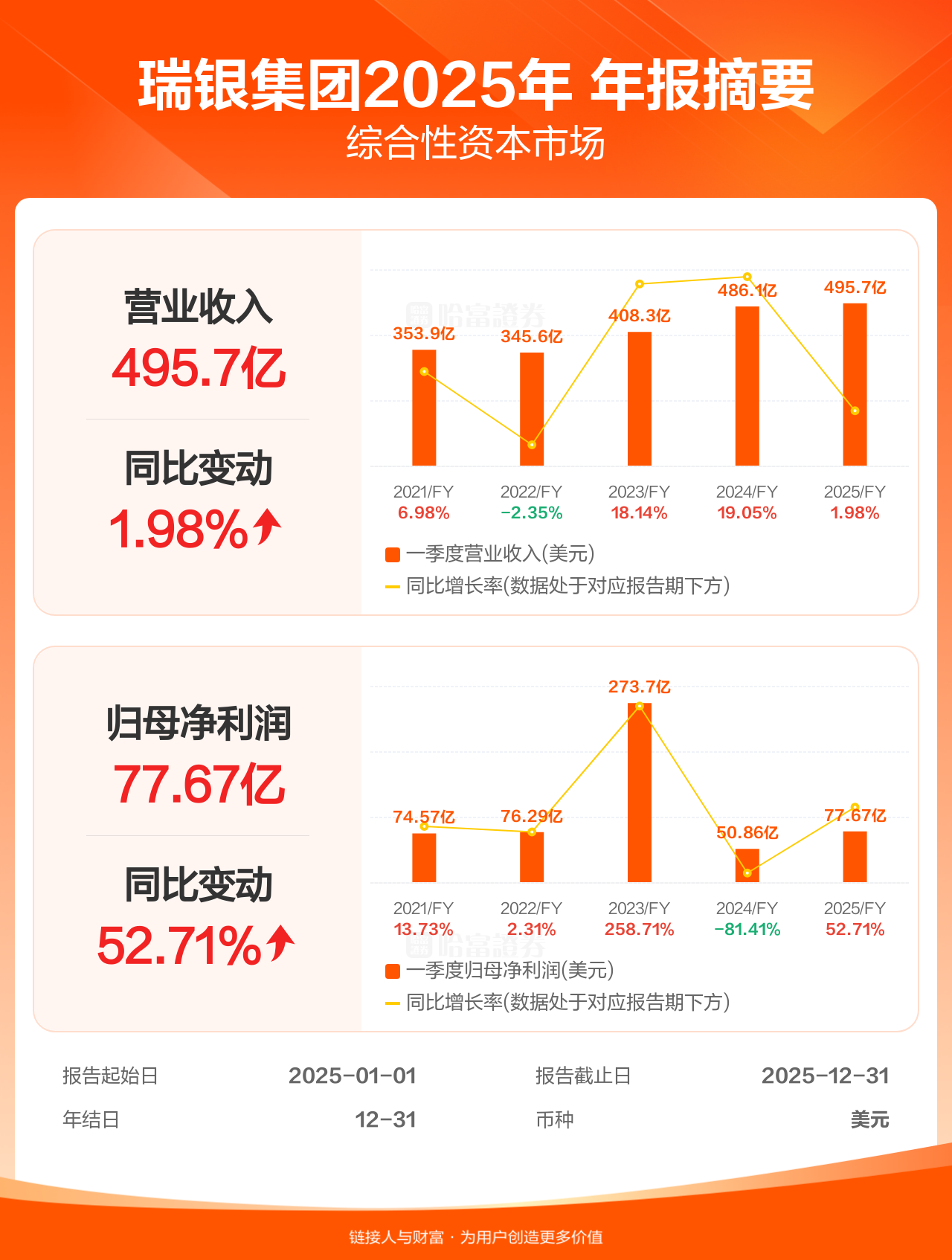 瑞银集团2月4日发布年报业绩,截至2025年12月31日的12个月内,该公司营业收入495.74亿美元,同比增长1.98%;公司权益持有人应占溢利(归母净利润)77.67亿美元,同比增长52.71%。