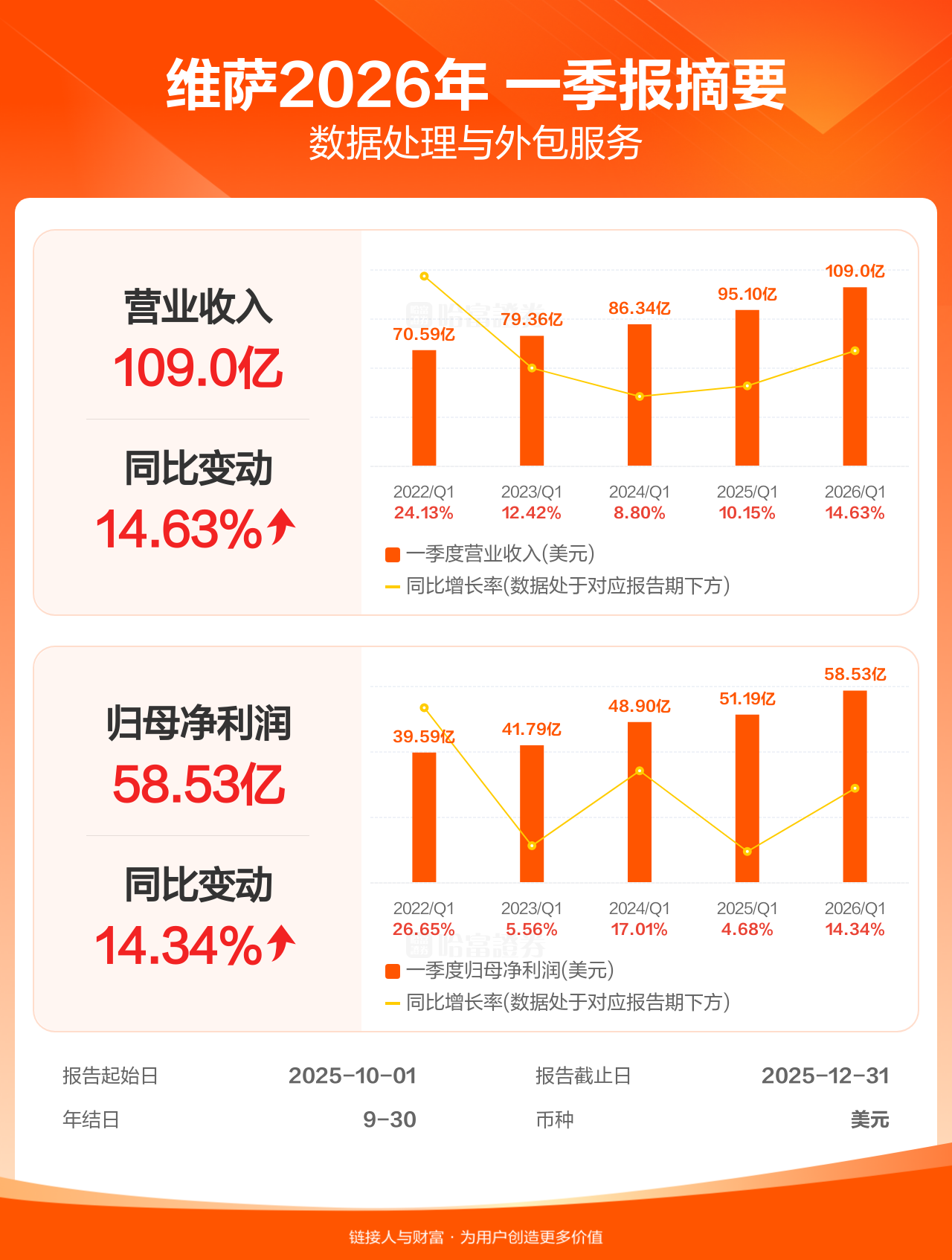 维萨1月29日发布一季报业绩,截至2025年12月31日的3个月内,该公司营业收入109.01亿美元,同比增长14.63%;公司权益持有人应占溢利(归母净利润)58.53亿美元,同比增长14.34%。