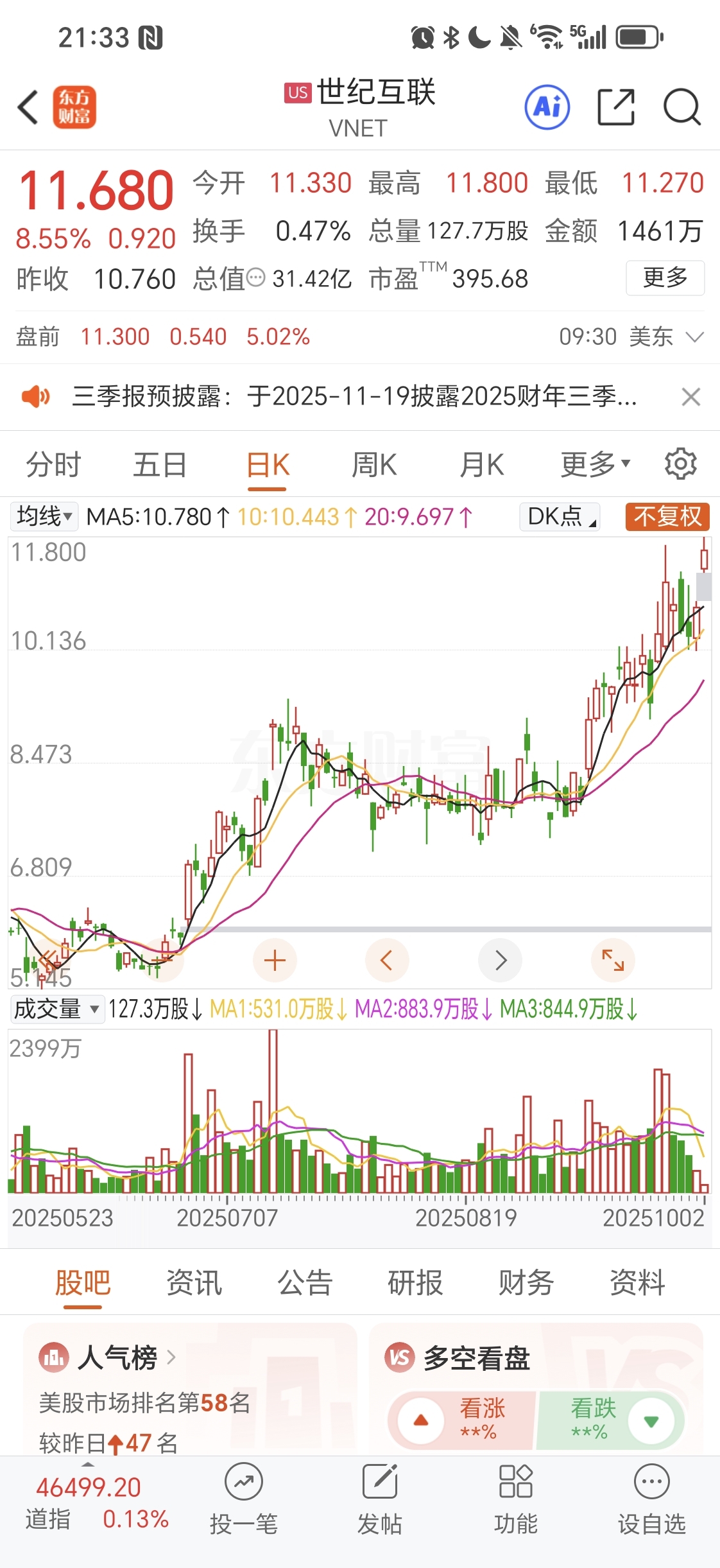 $世纪互联(NASDAQ|VNET)$ 准备加仓到百分之十,看这样子涨我估计加不上了。开盘就涨七个点。世纪互联
