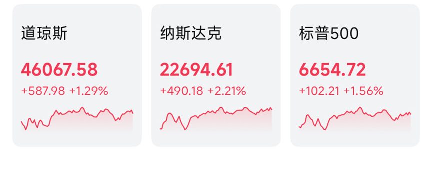 当地时间周一,美股三大股指全线收涨。截至收盘,道指涨1.29%报46067.58点,标普500指数涨1.56%报6654.72点,纳指涨2.21%报22694.61点。