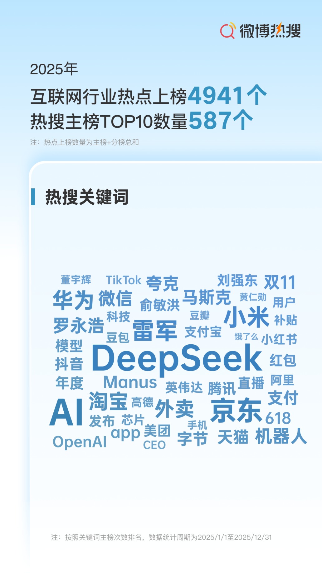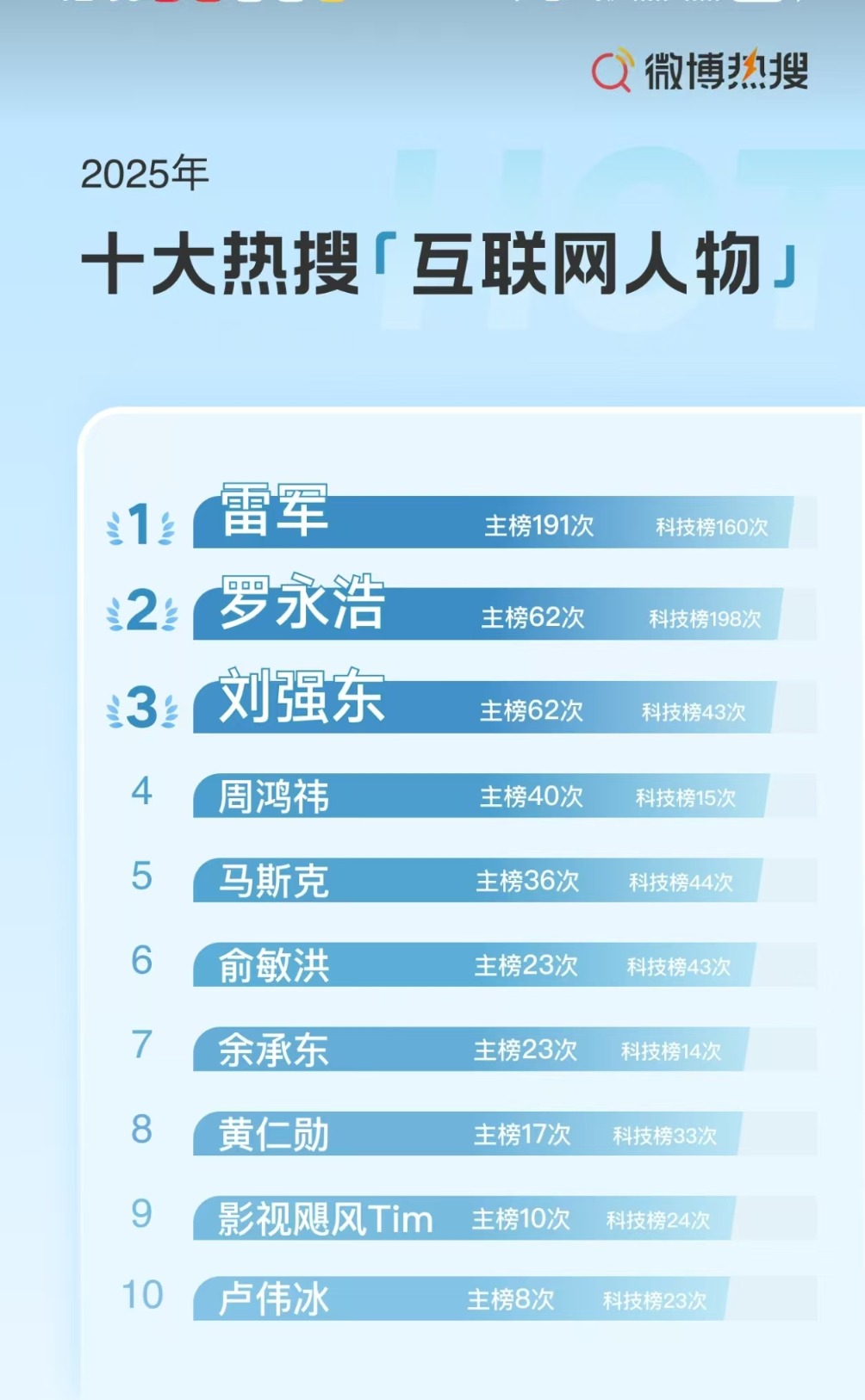 微博发布2025年十大热搜“互联网人物” 雷军、罗永浩、刘强东位列前三