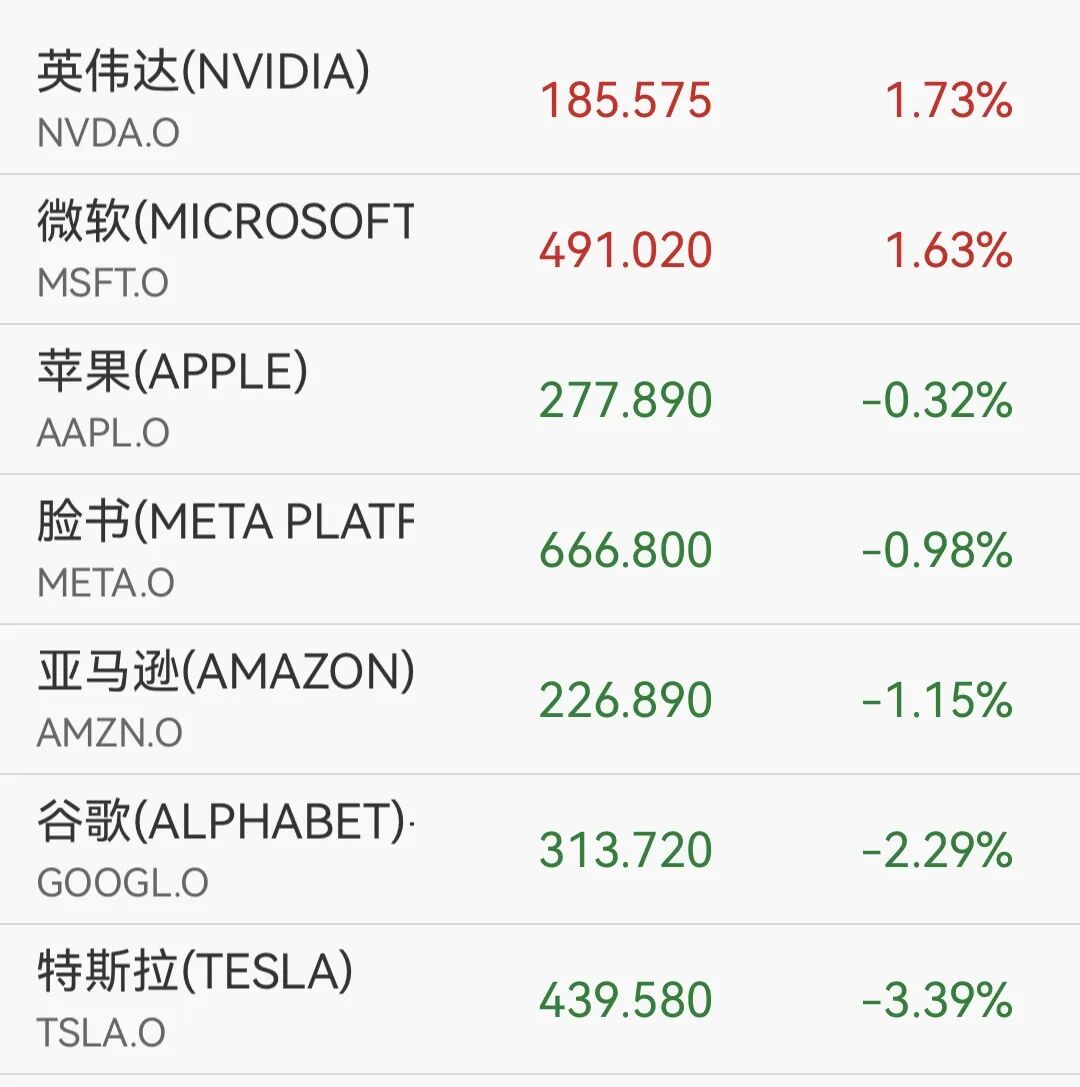 盘面上,大型科技股大多下跌,谷歌A跌2.29%,亚马逊跌1.15%,Meta跌0.98%,苹果跌0.32%,而微软收涨1.63%,英伟达涨1.73%。