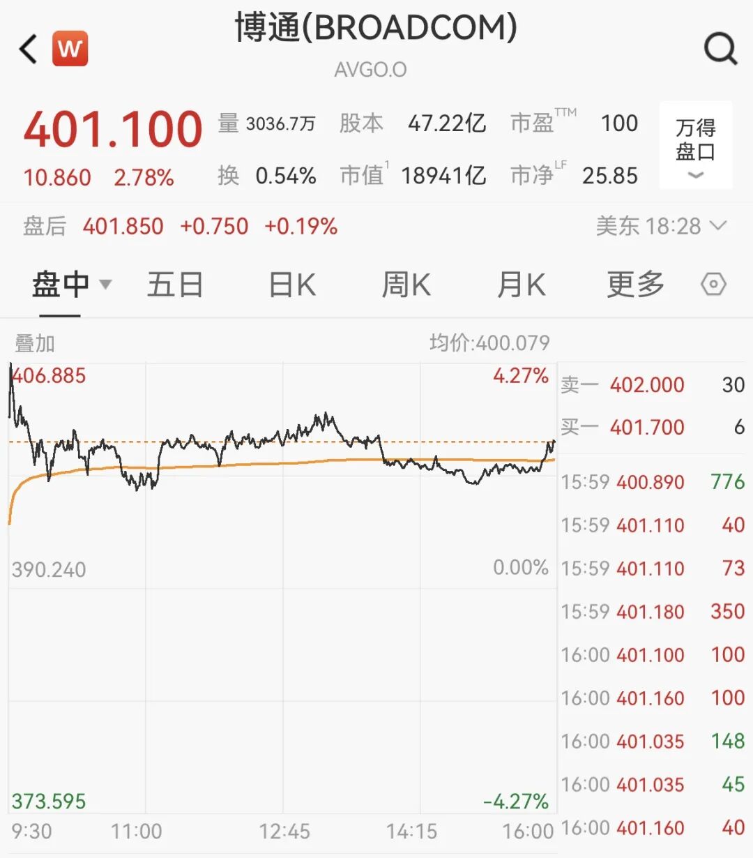 美东时间12月8日,芯片巨头博通股价涨近3%,创下历史新高,报401.1美元/股,最新总市值为18941亿美元。
