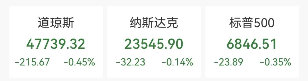 截至收盘,道琼斯工业平均指数收跌215.67点,跌幅为0.45%,报47739.32点。纳斯达克指数收跌32.23点,跌0.14%,报23545.904点。标普500指数收跌23.89点,跌0.35%,报6846.52点。