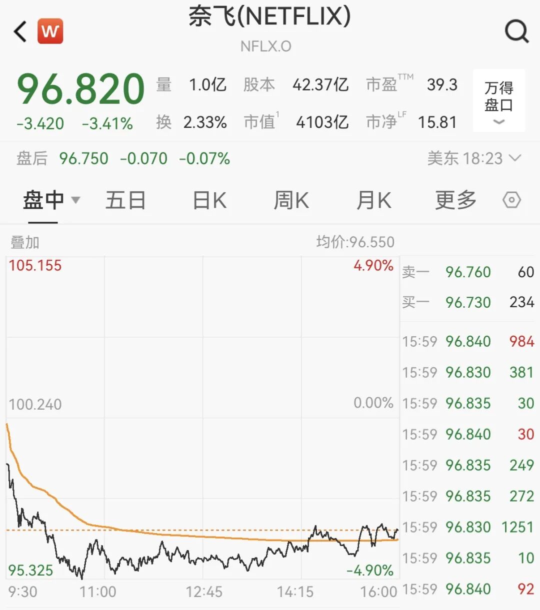 截至收盘,奈飞大跌3.41%,报96.82美元/股,最新总市值为4102亿美元。华纳兄弟探索公司收涨4.41%,报27.23美元/股。