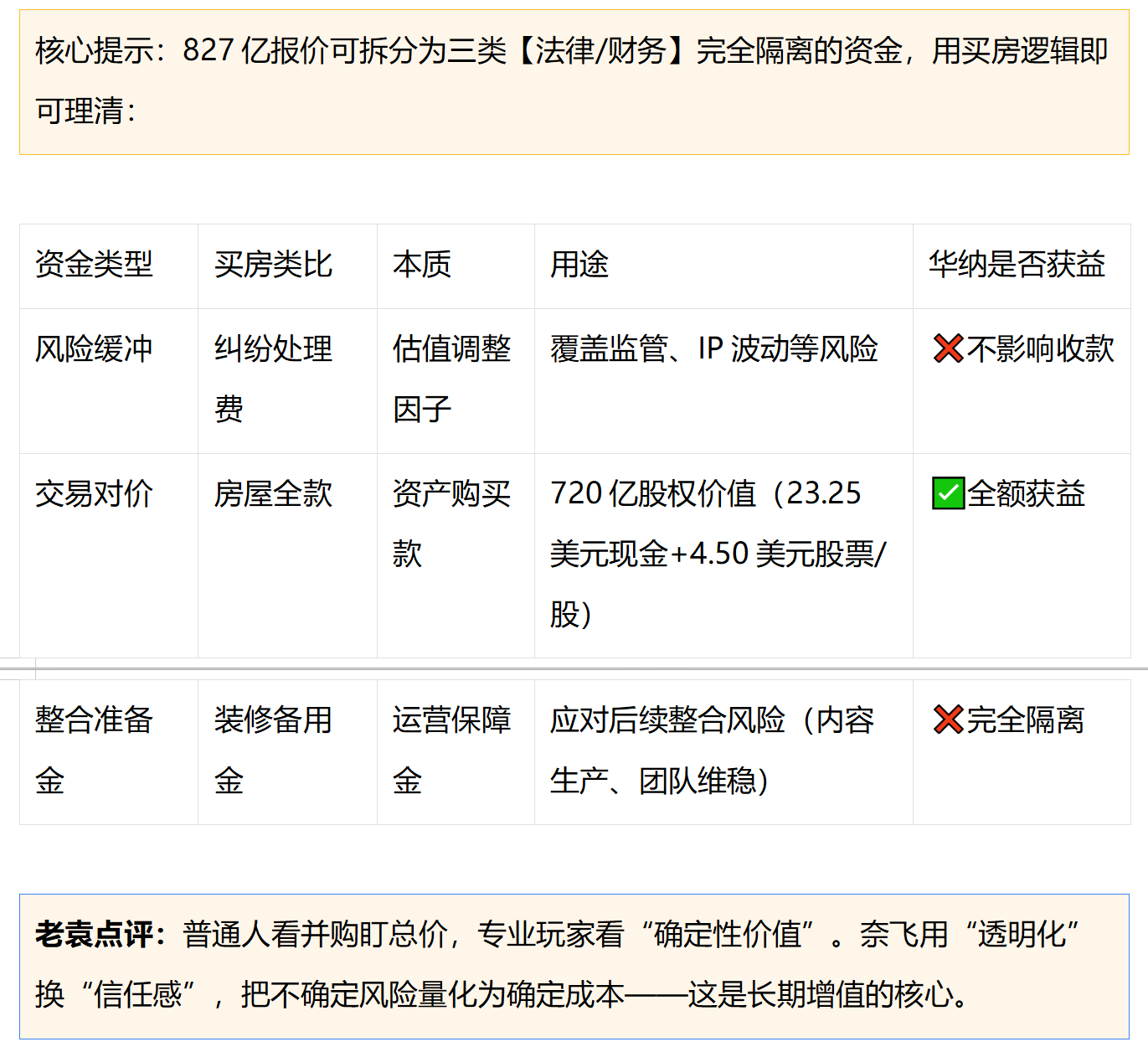 • 核查:资金是否足额到位(如奈飞590亿过桥贷款)、交易结构是否合规(剥离非核心资产)、潜在风险是否可应对(58亿解约费);