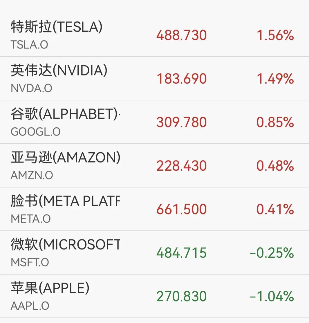 大型科技股多数上涨,特斯拉涨超1%,英伟达涨逾1%,谷歌涨近1%,亚马逊涨0.48%,脸书涨0.41%;苹果跌超1%,微软跌0.25%。