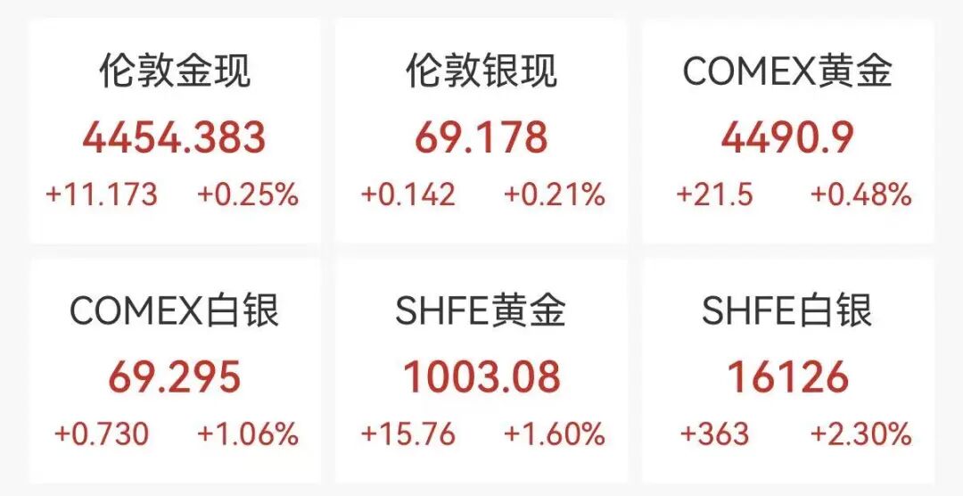 12月22日美股盘中,现货黄金涨2.48%至4449.18美元/盎司,创历史新高,全天持续走高。现货白银涨2.79%,报69.0304美元/盎司,之后持续上涨,触及69.4549美元的历史新高。