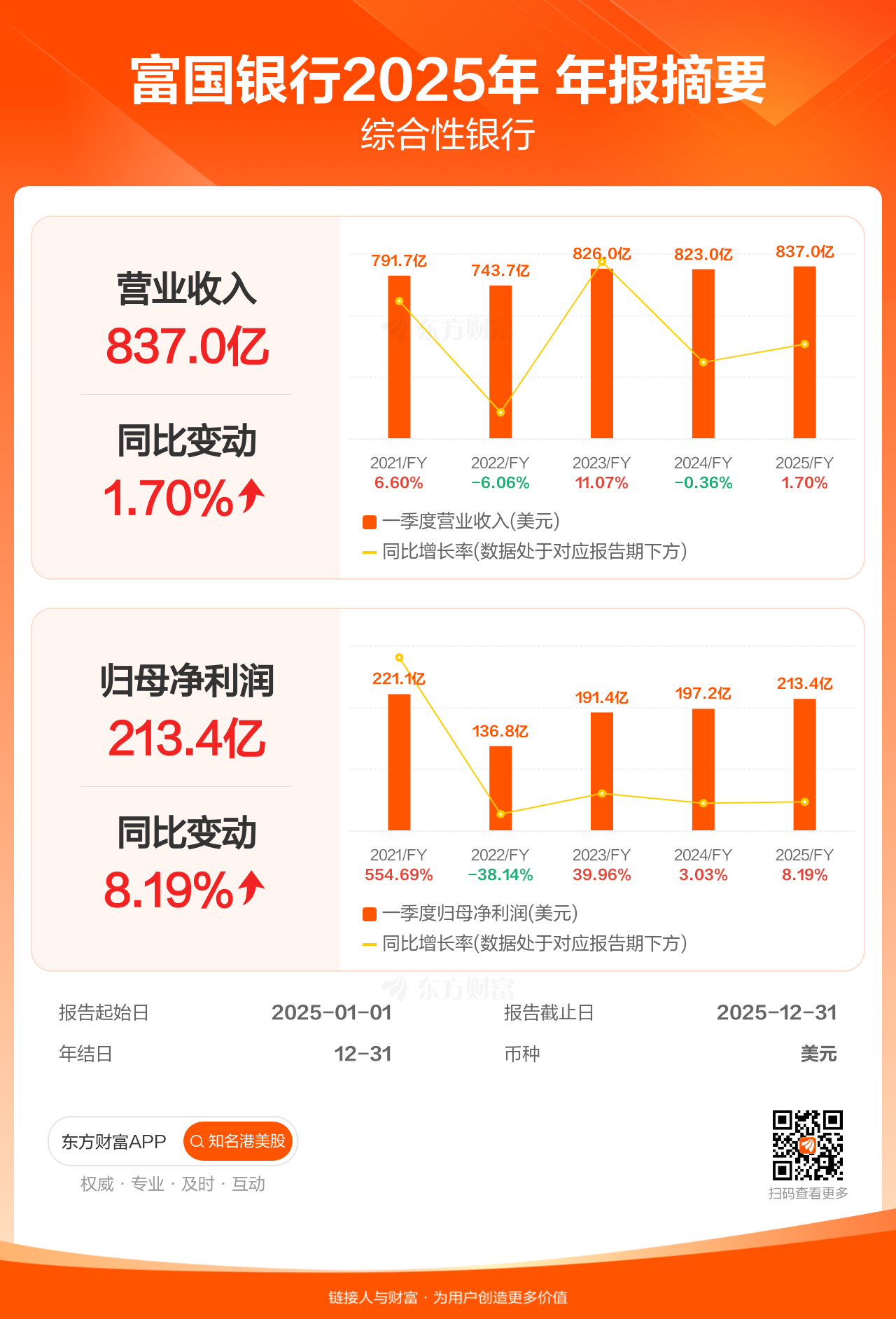 富国银行1月14日发布年报业绩,截至2025年12月31日的12个月内,该公司营业收入836.99亿美元,同比增长1.70%;公司权益持有人应占溢利(归母净利润)213.38亿美元,同比增长8.19%。