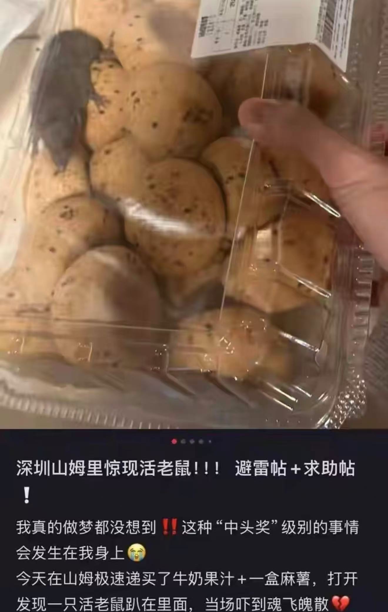 12月9日,一名消费者在社交平台上发布“深圳山姆里惊现活老鼠”求助帖,其称通过山姆外卖平台“极速达”购买的牛奶果汁以及一盒自有烘焙品牌MM麻薯,打开包装后,烘焙盒子内部有一只活老鼠爬在麻薯上。部分麻薯已出现疑似啃食痕迹,甚至有两只被 “掏空”。