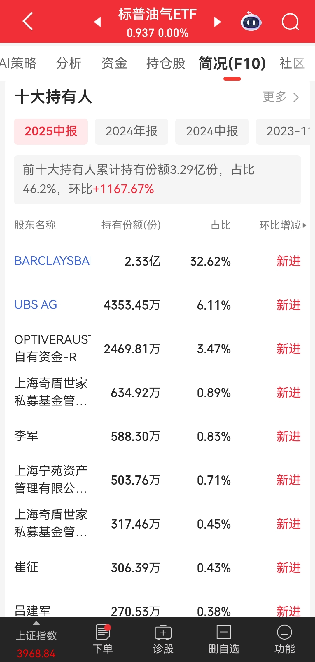 $标普油气开采指数ETF-SPDR(AMEX|XOP)$ 看一下两个场内油气中报、年报前十大持有人,巴克莱银行已经布局了,不赚到钱是不会走的