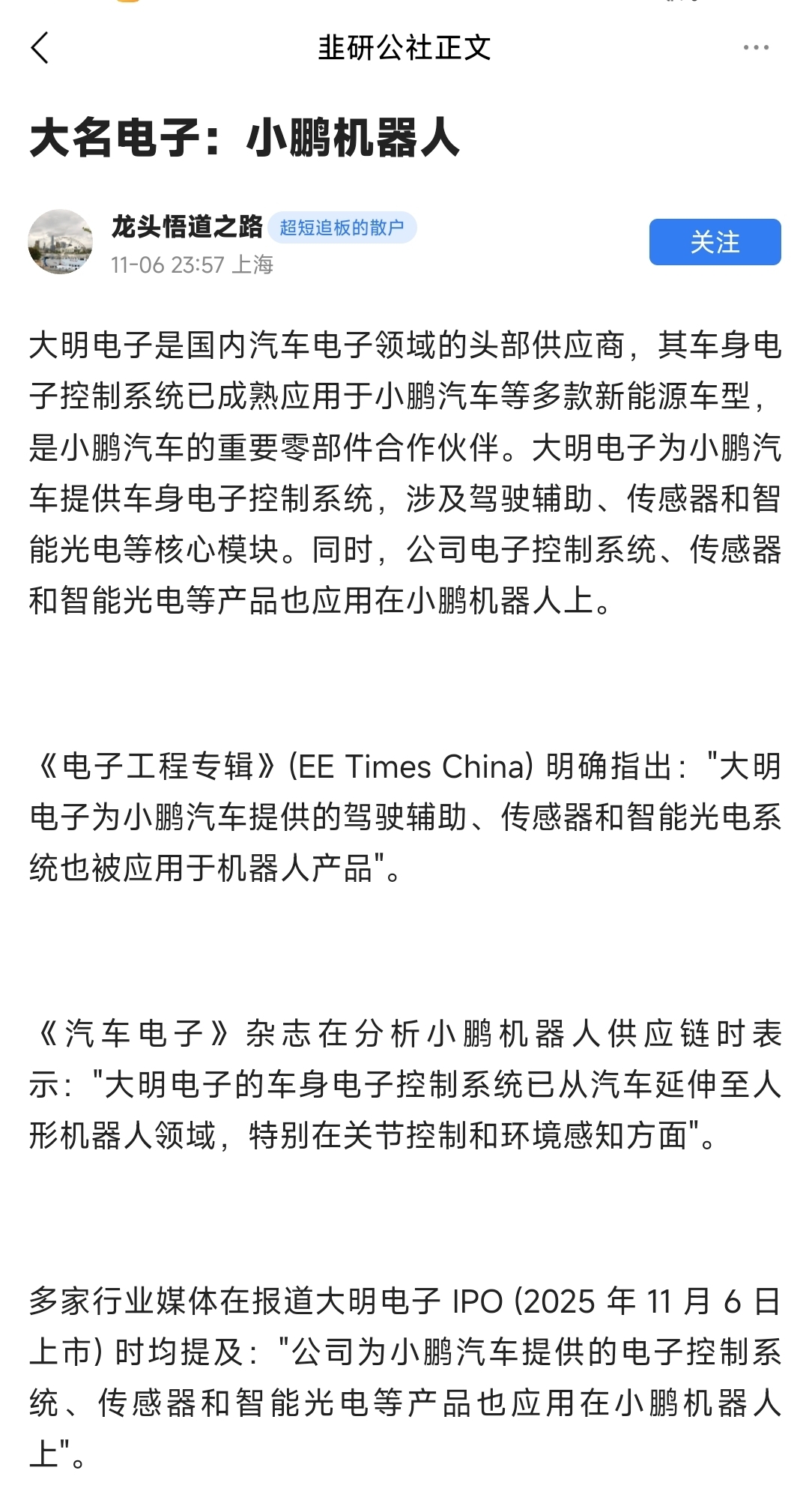 大明电子供货小鹏机器人$小鹏汽车(NYSE|XPEV)$ $N大明(SH603376)$