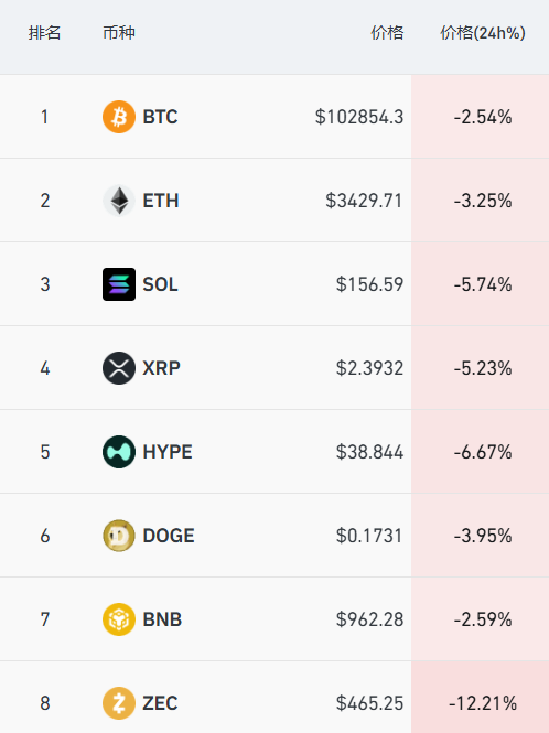 加密货币主要币种集体下跌,截至北京时间12日6:30,比特币跌超2%,报102854.3美元/枚。以太坊跌超3%、BNB跌超2%、狗狗币跌近4%,过去24小时,加密货币全网超15万人被爆仓。