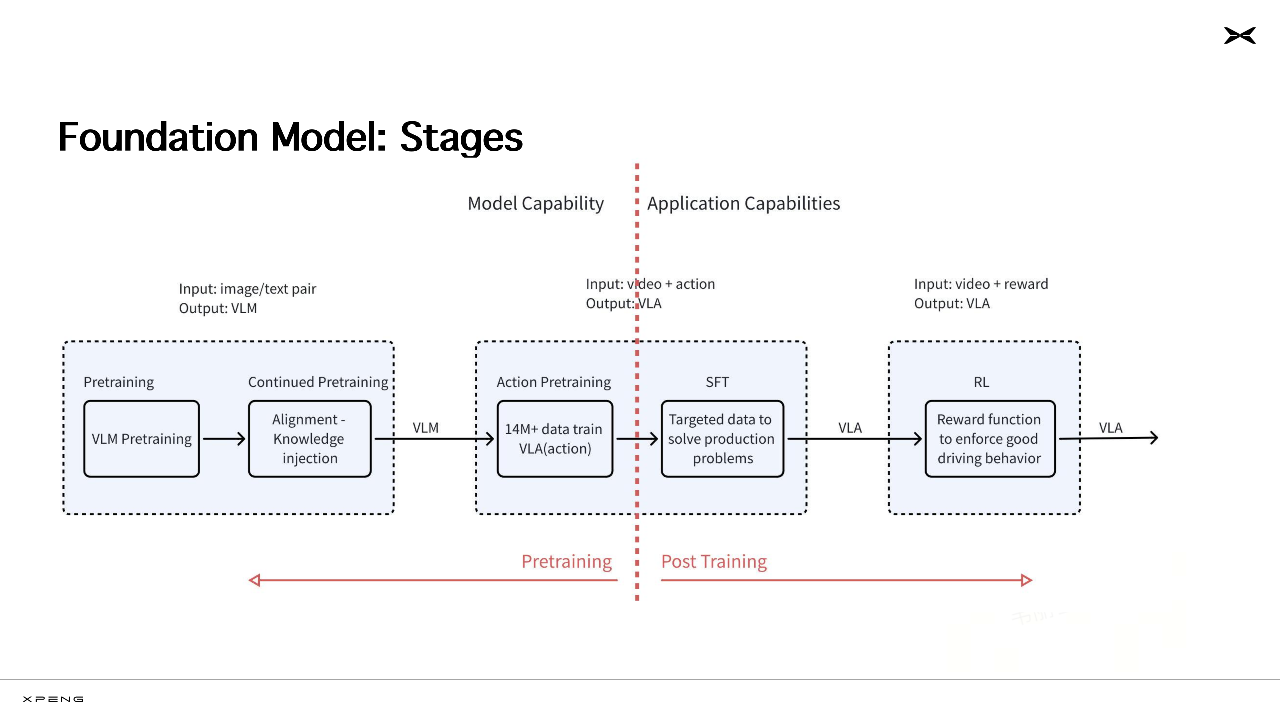 在演示中,他将小鹏物理世界基座模型分了三个阶段(Foundation Model Stages):