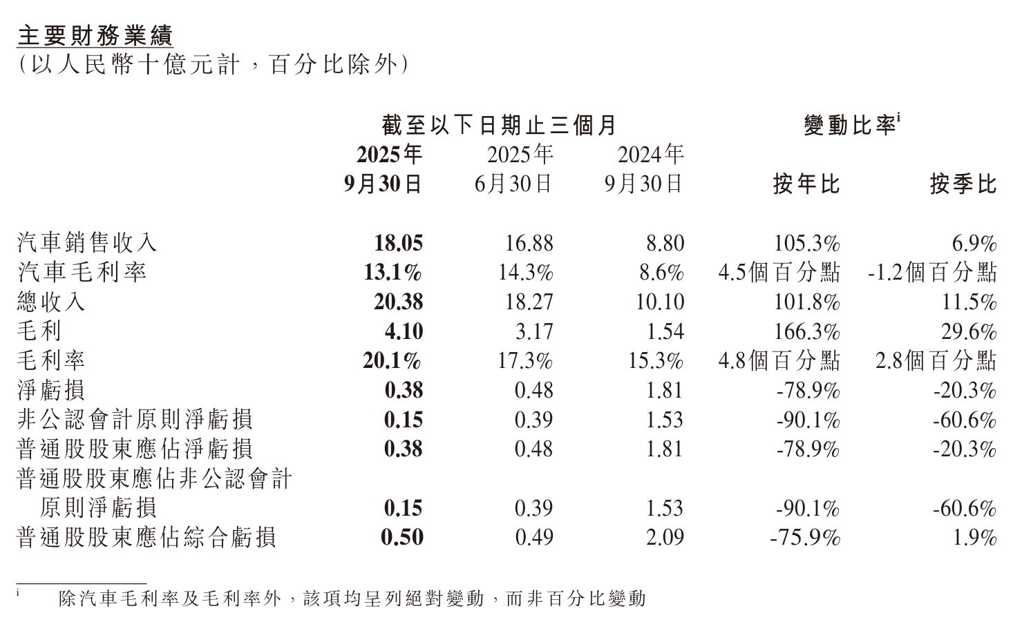 具体而言,小鹏汽车第三季度共交付11.6万辆汽车,同比增长149.3%,环比增长12.4%;实现营业收入203.8亿元,同比增长101.8%,环比增长11.5%;净亏损收窄至3.8亿元,上年同期净亏损18.1亿元,今年第二季度净亏损4.8亿元。截至2025年9月30日,现金及现金等价物、受限制现金、短期投资及定期存款为483.3亿元。