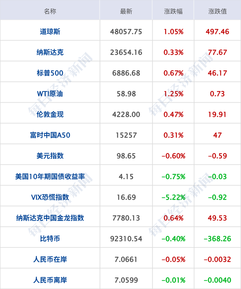 美股三大指数集体收涨,道指涨1.05%,纳指涨0.33%,标普500指数涨0.68%,大型科技股多数上涨,特斯拉、亚马逊、博通、谷歌涨超1%,Meta跌超1%,微软跌超2%;存储、储能概念股、基建股涨幅居前,GE Vernova涨超15%,Sandisk涨超6%,美光科技涨超4%,卡特彼勒涨超3%;加密货币、电子游戏与多媒体板块跌幅居前,Roblox、游戏驿站跌超4%,Strategy跌超2%。纳斯达克中国金龙指数涨0.65%,中概股多数上涨,阿特斯太阳能涨超5%,晶科能源涨逾3%,贝壳涨近4%,小马智行涨超3%,腾讯音乐、亿航智能跌超1%。
