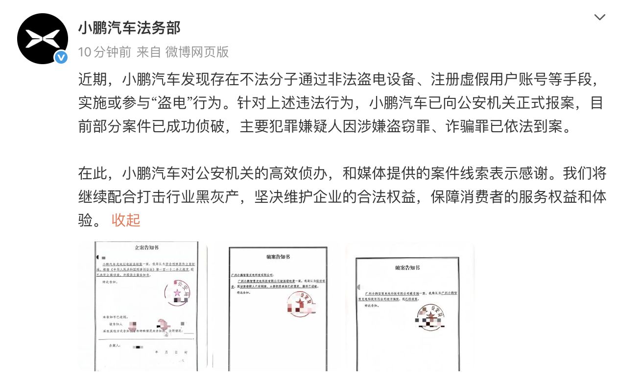 近期,小鹏汽车发现存在不法分子通过非法盗电设备、注册虚假用户账号等手段,实施或参与“盗电”行为。针对上述违法行为,小鹏汽车已向公安机关正式报案,目前部分案件已成功侦破,主要犯罪嫌疑人因涉嫌盗窃罪、诈骗罪已依法到案。