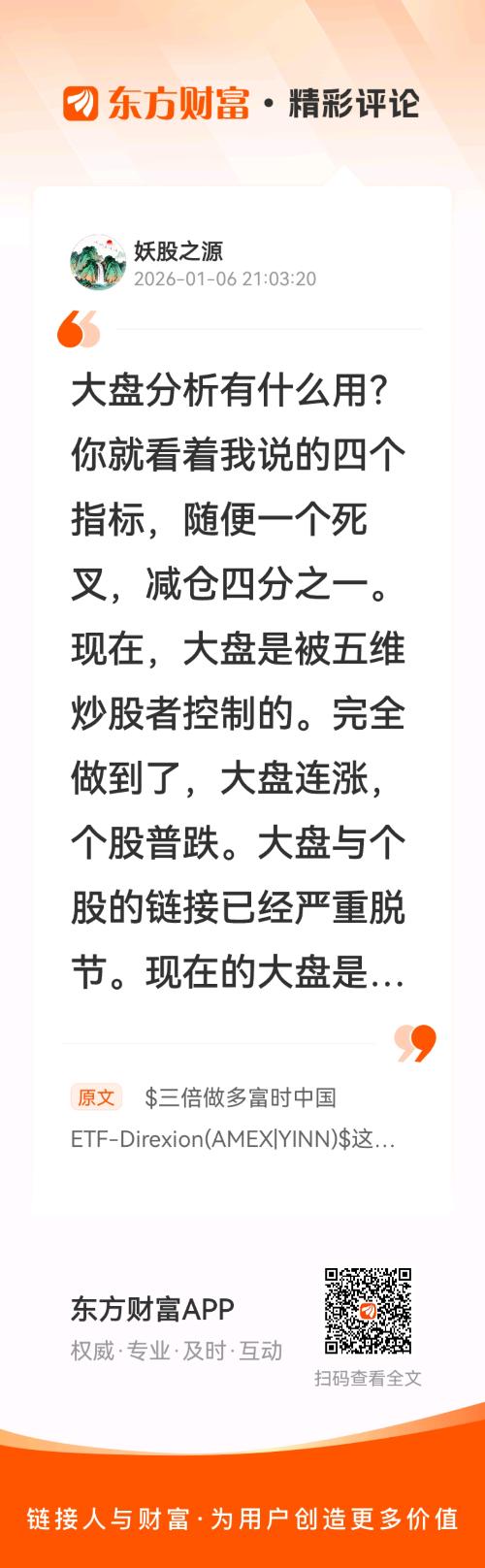 //@妖股之源 :大盘分析有什么用?你就看着我说的四个指标,随便一个死叉,减仓四分之一。现在,大盘是被五维炒股者控制的。完全做到了,大盘连涨,个股普跌。大盘与个股的链接已经严重脱节。现在的大盘是被控制的大盘,既然是被控制的,分析了也没意思。