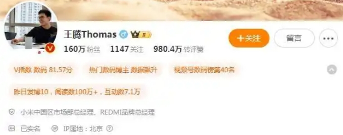 【小米王腾升职了?微博认证更新为小米中国区市场部总经理、REDMI品牌总经理】