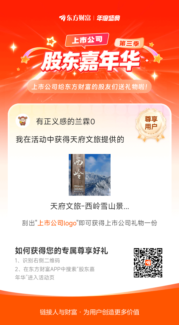 我在股东嘉年华活动中获得天府文旅-西岭雪山景区门票+鸳鸯池索道往返票,2026开年大顺!#【有奖】第三季股东嘉年华温暖启幕,晒出你的“锦鲤时刻”!#