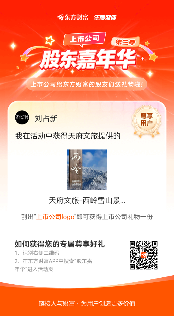 我在股东嘉年华活动中获得天府文旅-西岭雪山景区门票+鸳鸯池索道往返票,快来一起玩!#【有奖】第三季股东嘉年华温暖启幕,晒出你的“锦鲤时刻”!#