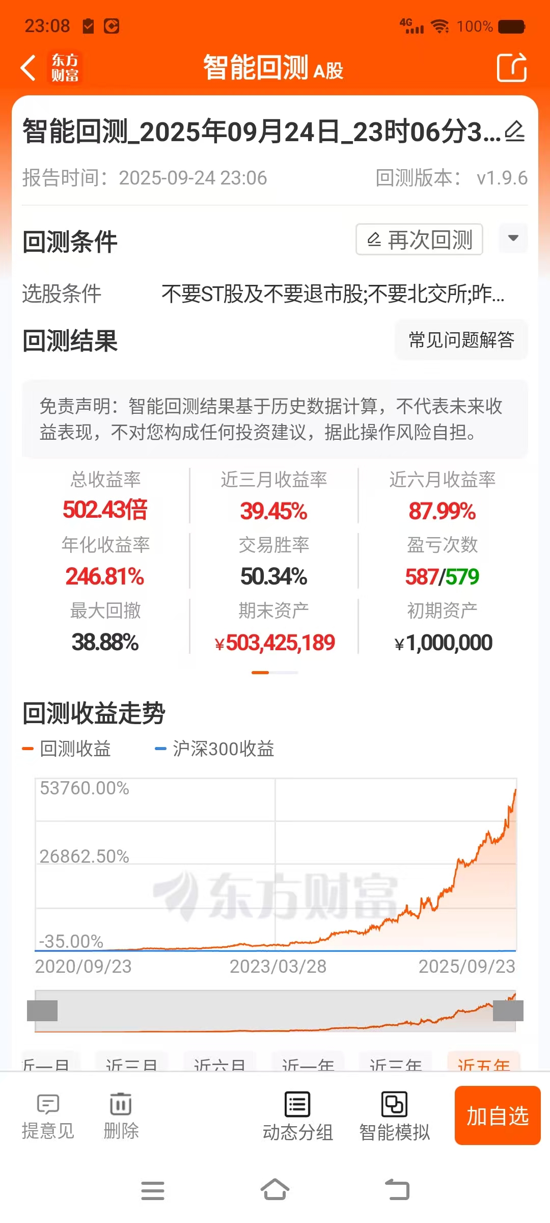 500倍,非涨停接力,45度角稳定向上,穿越牛熊,可以交换这个策略的缺点就是偏稳
