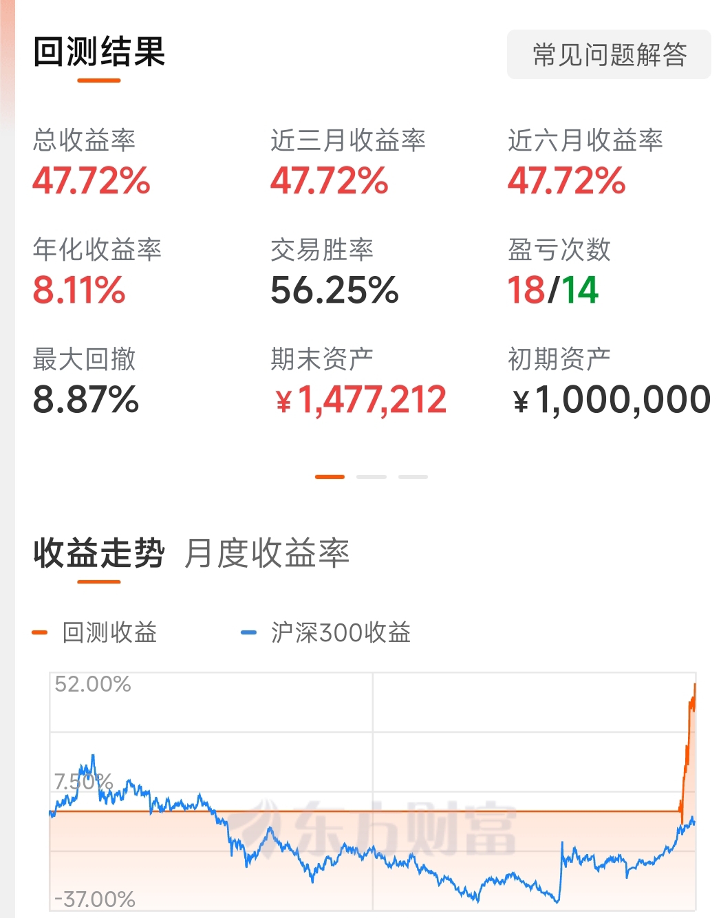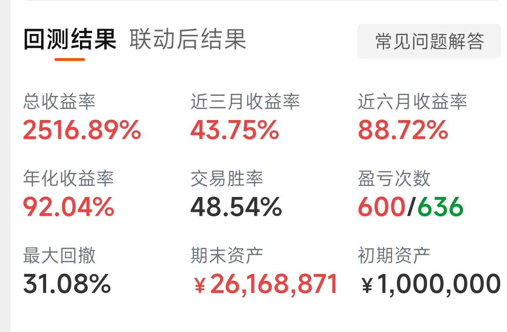 联动后效果好不,你们有没有根据回测策略买的,我又找到一个,历史不能回测,只能回测最近一段时间的,看着效果不错,直线起飞,后面图是新策略,不敢实盘。