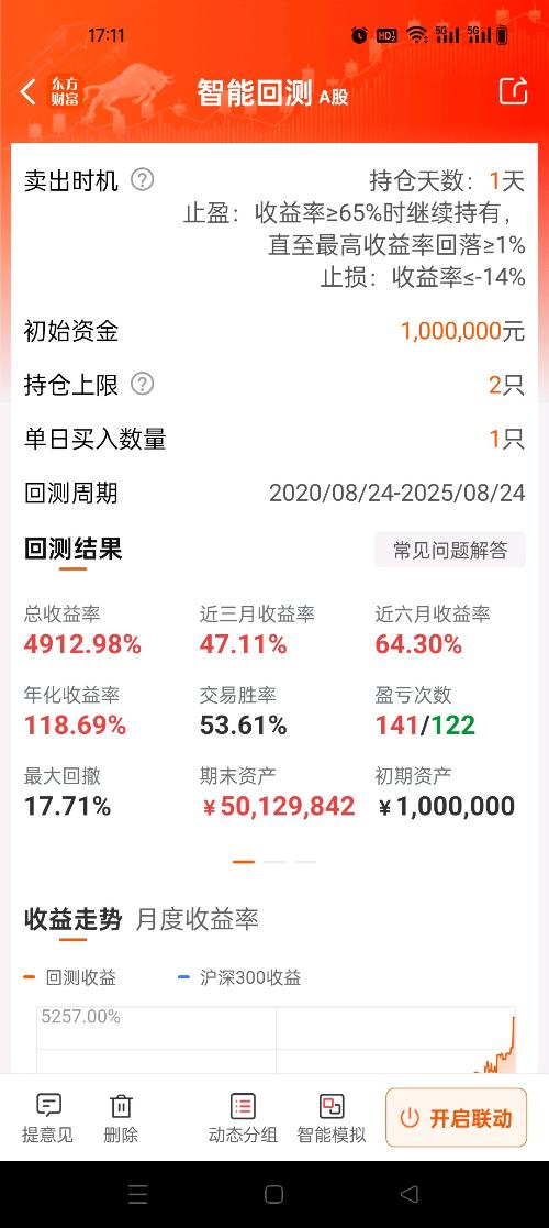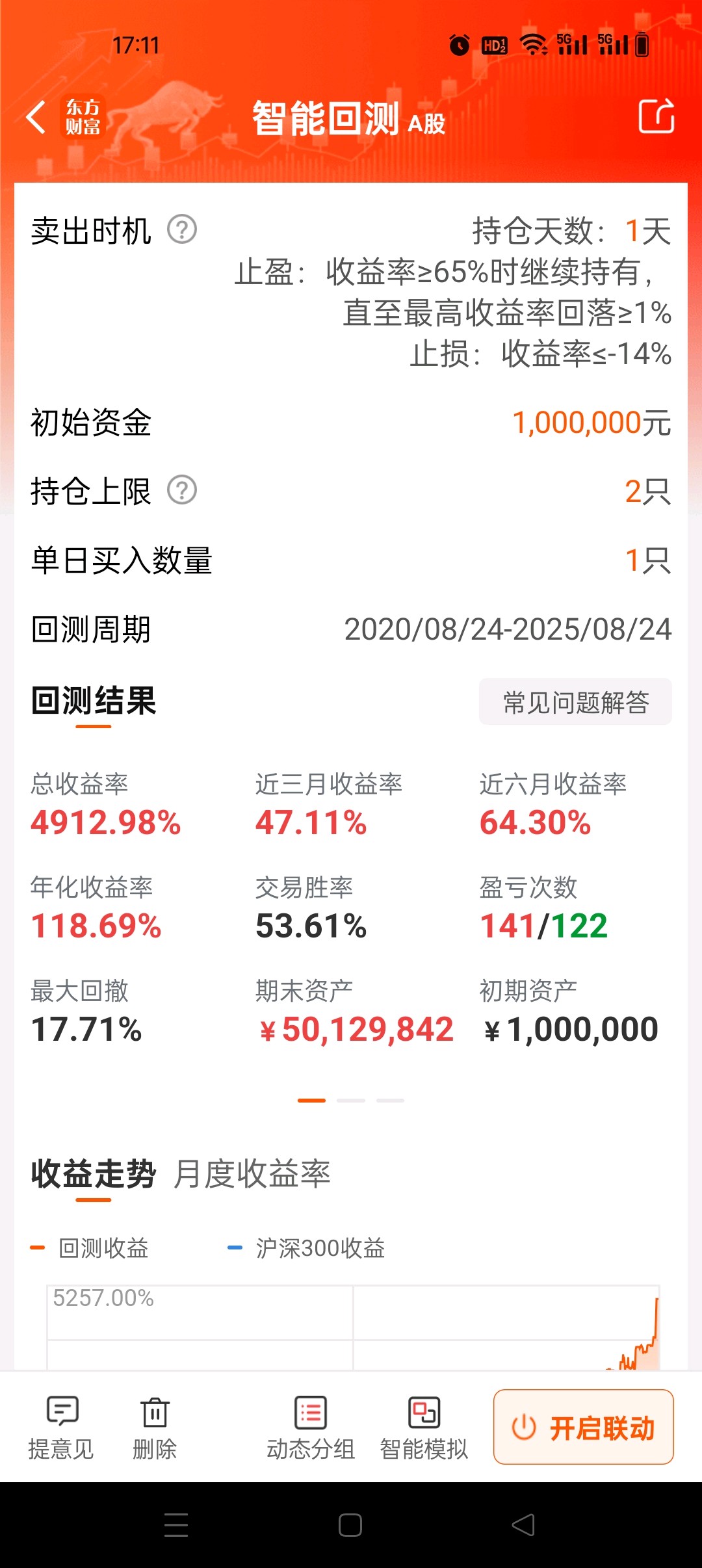 创业板智能模拟跟踪记。紧跟踪模式方向理念2个月+,终于翻倍了。收益100+%。所以模式帮助还是很大,现在主要做两个模式,一个是主力资金净流入模式。一个是强势股低吸模式,都是创业板。不过振幅确实也很大。