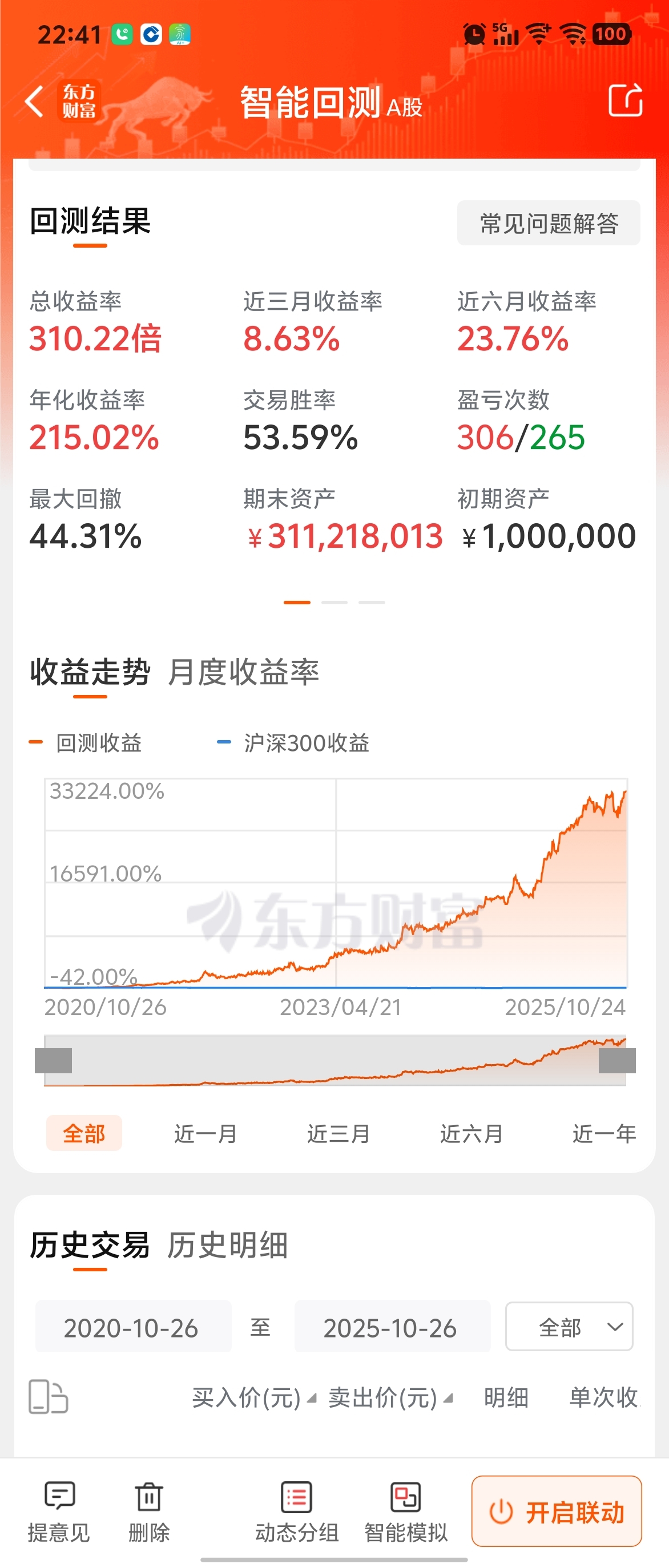 5年310倍,胜率高达53%,从上个星期测试完成到今天,每天出票一只,5天5票,有4个当天涨停板