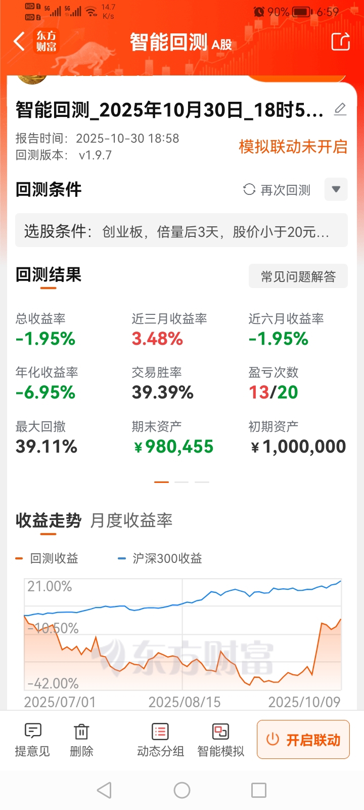 @迷惘之倍量战法 倍量兄,你那个倍量3天5年收益挺惊人的!最近也不错。但我回测了创业板指数单边上涨的时间里,7月1号到10月9号回测,却是收益为负数,请教大佬,策略模型该如何判断可以进场实盘了?我看了最近它的回测曲线上涨趋势,是不是可以实盘跟买入了?