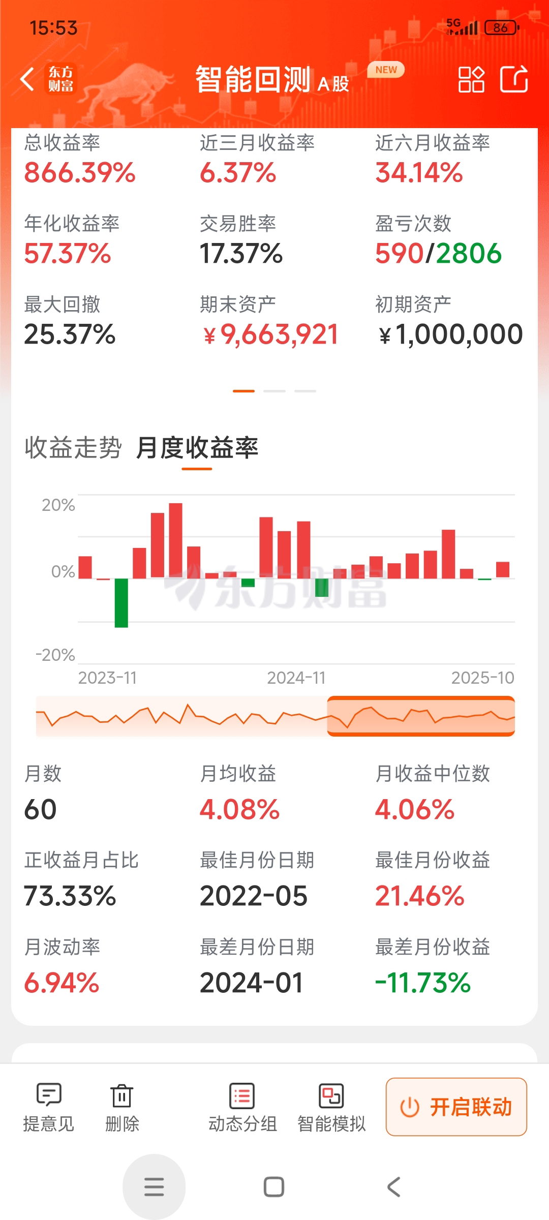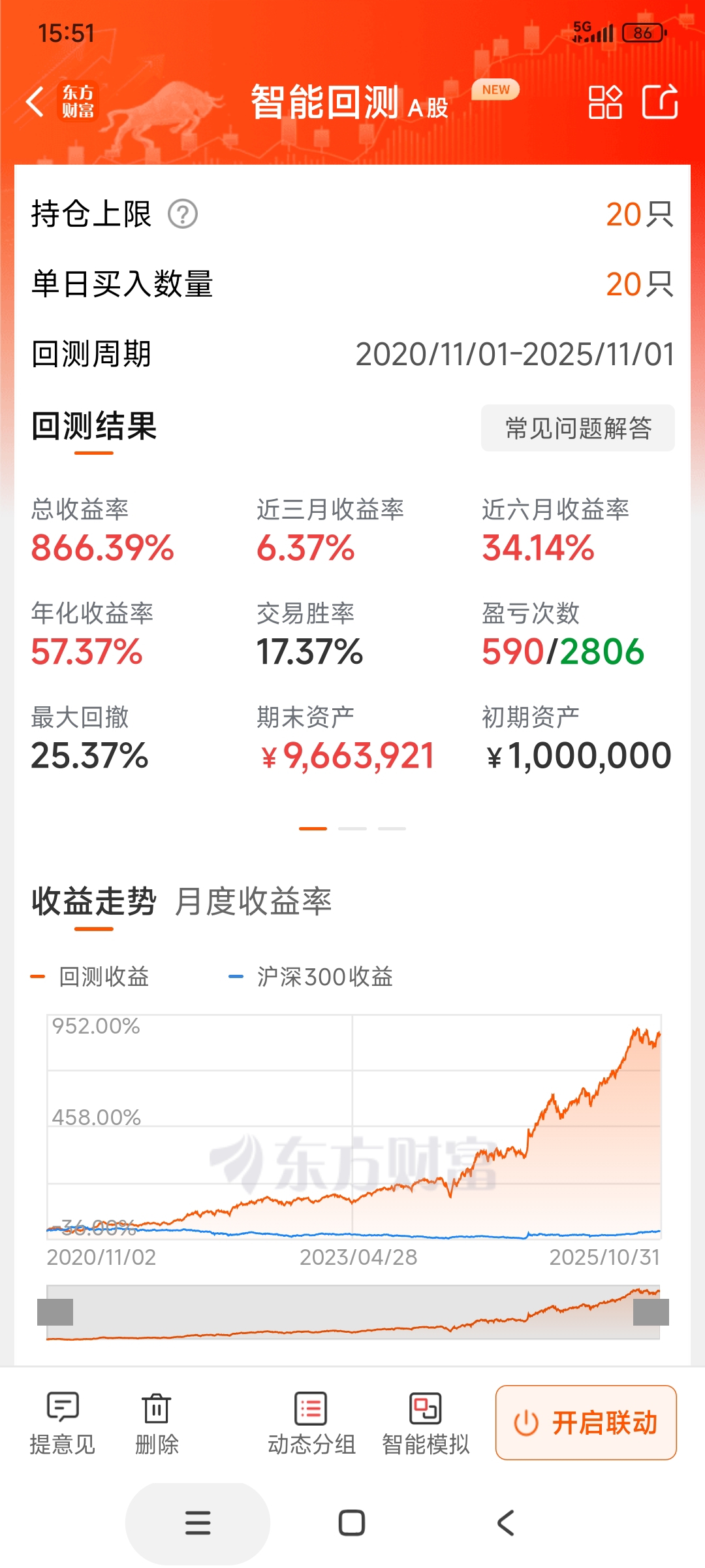 五年年化57%,回撤25%,可支持大资金100个持仓,回测样本几千个,曲线稳定,以小胜率博大牛股