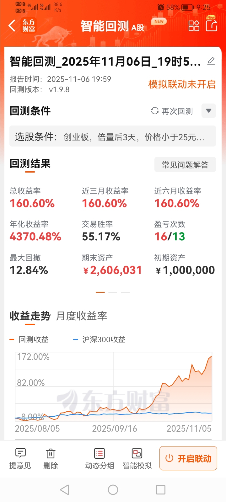 用了倍量兄的倍量3优化得到的,三个月有了160%收益,回撤12%,这样曲线对我来说,已经是仰望的级别了!