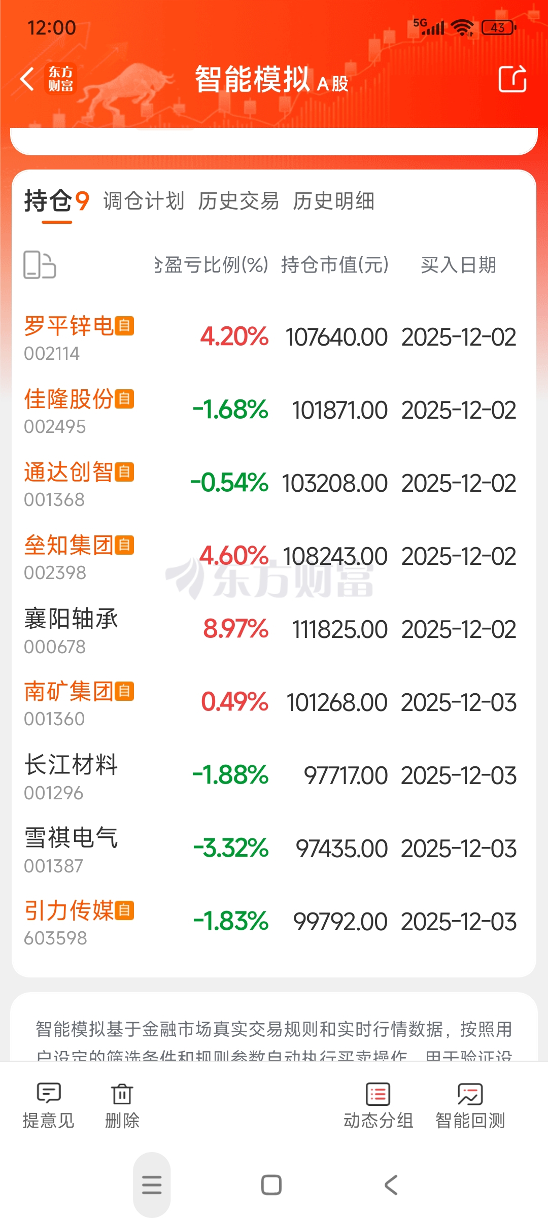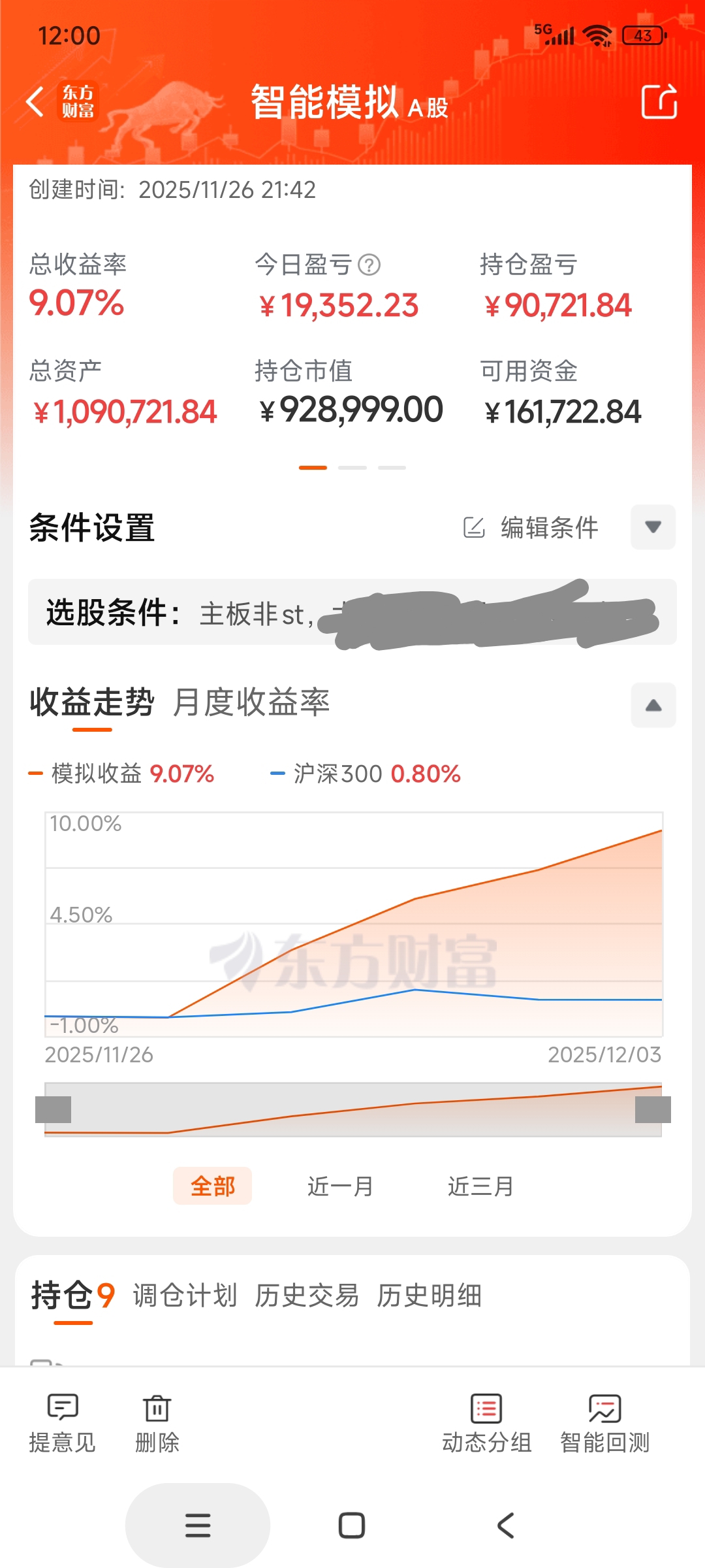 上周建的10仓模拟策略,天天大涨。早上高位卖了通宇,现在9仓