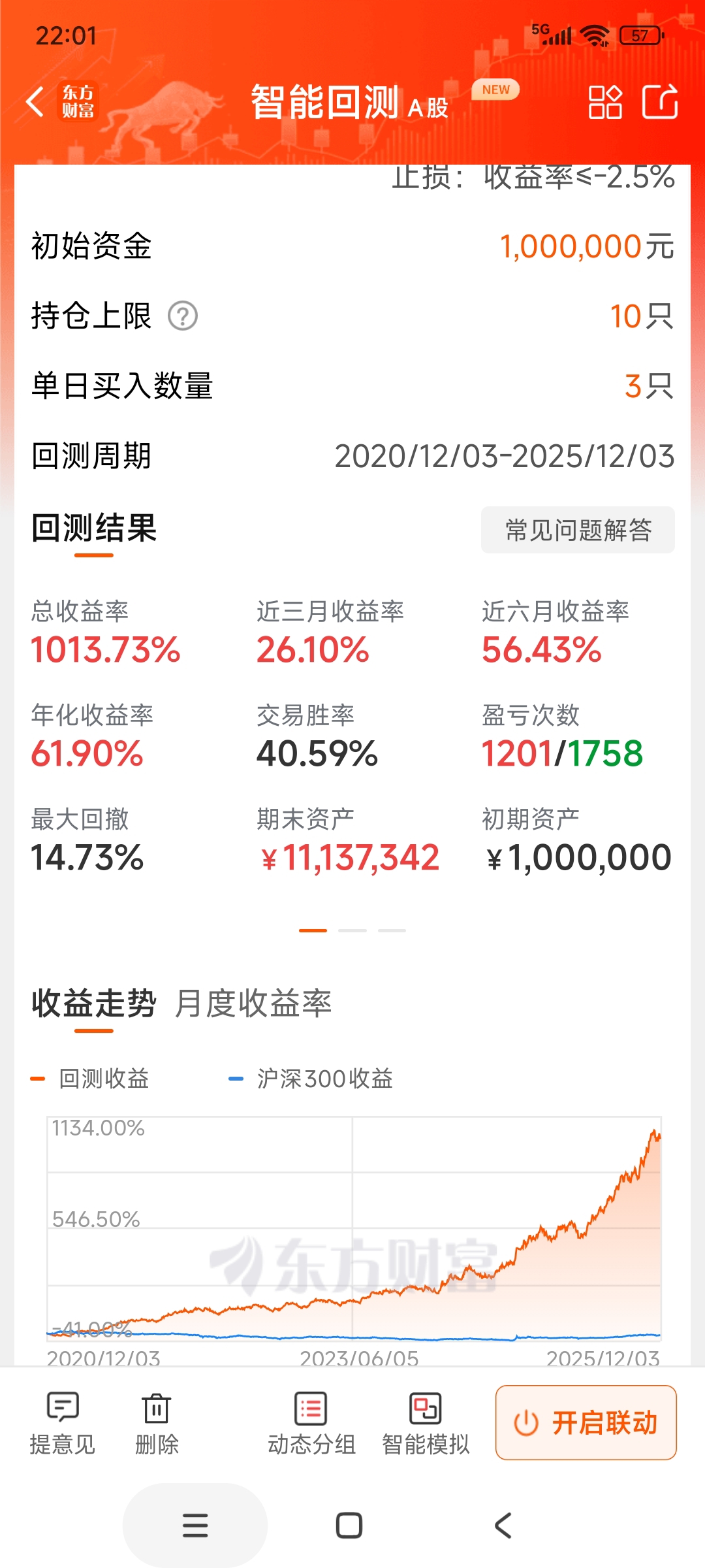 绝对稳定的策略。10仓持股5天,不追高不打板,只买低位低波股,涨一波就跑。胜率低是因为止损点极低,低波股亏2.5%就走。所以亏不了大钱。曲线绝对稳定。创业板。有时间在弄个主板。