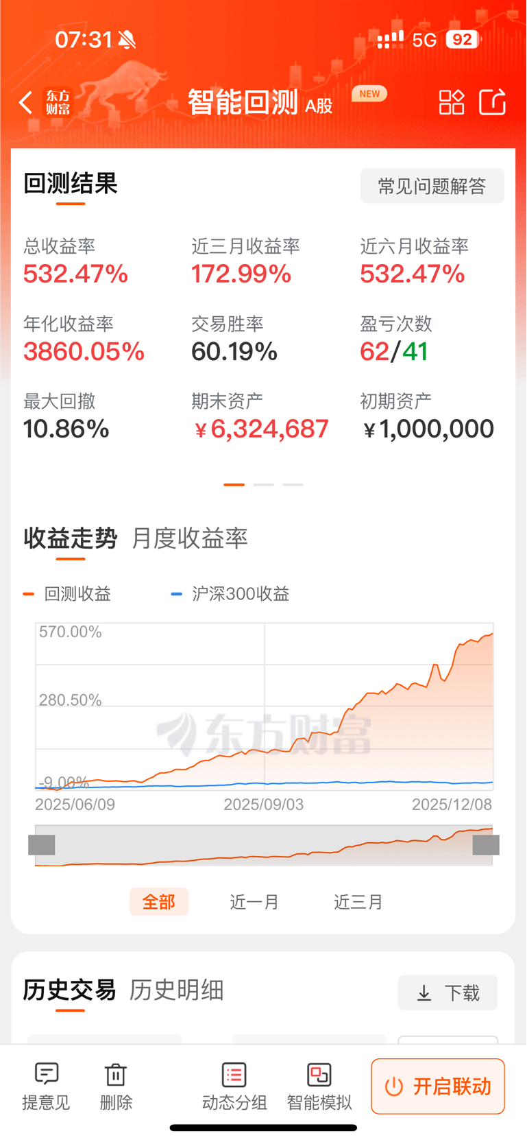 2号策略:我对一年的回测进行了逐笔复盘,结果是一年交易178次,52次我确认亏损,其他都有机会赚钱,就看如何操作。下面是6个月2/1仓位测试。我不管他收益率成功率的展示效果,只干实盘。